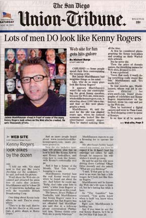 Going way back in the WayBack Machine, all the way back to the early days of the internet, Jaimie had an idea for a funny website. At the time, there were a few humorous sites making the rounds...MulletsGalore, Am I Hot or Not, and other weird stuff. Jaimie had noticed that a lot of older gentlemen of a certain age start to look like The Gambler, Kenny Rogers, whether they mean to or not. He wanted to learn how to make websites for the first time, so he used his Kenny lookalike idea as a guinea pig for his first site. Thus was born MenWhoLookLikeKennyRogers.com. It started off small, with a few photos of guys and some tips on how to look like Kenny, plus a few tips on where to look for your own Kennys. He sent the link to a few friends and they thought it was funny and forwarded it to other friends and the rest is history. The next thing you know, a hundred, a thousand, and then two thousand people a day were coming to the site. Then, one night, Harry Shearer of SNL, The Simpsons and Spinal Tap said on a TV show talk show that the funniest thing he'd seen in years was a website called MenWhoLookLikeKennyRogers.com. And then it was 16,000 people a day. Later on it was featured as the answer to a question in Trivial Pursuit and a character in a popular video game was wearing a MWLLKR shirt. Kenny himself started getting asked about the site and he declared that he loved it and his favorite "Kenny" was Hot Tub Kenny. And then the topper...Yahoo! named the website one of the Top 100 Websites in the History of the Internet. Seriously. The site continues on RIGHT HERE, basically as an archive, still making people laugh and still causing the real Kenny Rogers to get asked for the gazillionth time, "What do you think of MenWhoLookLikeKennyRogers.com?"