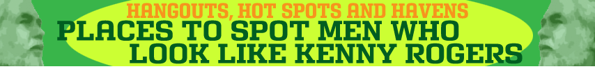STATE FAIRS • AIRPORTS • WAFFLE HOUSE • SANDWICH SHOPS • MALLS • CONSTRUCTION SITES • BOOT WORLD • BINION'S CASINO IN LAS VEGAS • SHAKEY'S PIZZA • GUN SHOWS • CAR LOTS • WHATABURGER • SOFTBALL GAMES • DRAG RACES • SCHOOL CARNIVALS • FISH FRIES • PAWN SHOPS • BEER GARDENS • STURGIS • HOME DEPOT • HOCKEY GAMES • BARS WITH SAWDUST FLOORS • CHURCH • SPORTING GOODS SECTION AT K-MART • HORSE TRACKS • RENO, NEVADA • OFFICIAL NASCAR EVENTS • STEAK AND ALE • STREET FAIRS • AA MEETINGS • SKI RESORTS • FEED STORES • POOL TOURNAMENTS • TAXIDERMY SHOPS • TIRE STORES • SEARS • BARBER SHOPS (NOTHING UNISEX!) • AUTO PARTS STORES • WINE SHOPS • CAR STEREO SHOPS • SWAP MEETS • RENAISSANCE FAIRES • STORAGE UNIT OFFICES • CRACKER BARRELS • BAR-B-QUE RESTAURANTS • HARLEY SHOPS • SAND AND GRAVEL SALES • REPTILE STORES • MONSTER TRUCK SHOWS • OFFICE DEPOT • IKEA (JUST KIDDING!) • YOUR FRIEND'S FACEBOOK PHOTO GALLERY • LEATHER SUPPLY STORE • CHRISTMAS TREE LOTS • ACTUAL KENNY ROGERS CONCERTS • CABLE TV INSTALLERS • CANCUN, MEXICO • ANYWHERE IN IOWA • KIDS SOCCER GAMES • OUTDOOR MUSIC FESTIVALS • DRY CLEANERS • MEAT DEPARTMENTS • MEN'S WAREHOUSE (I GUARANTEE IT!) • SAND CASTLE CONTESTS • YOUR UNCLE'S HOUSE